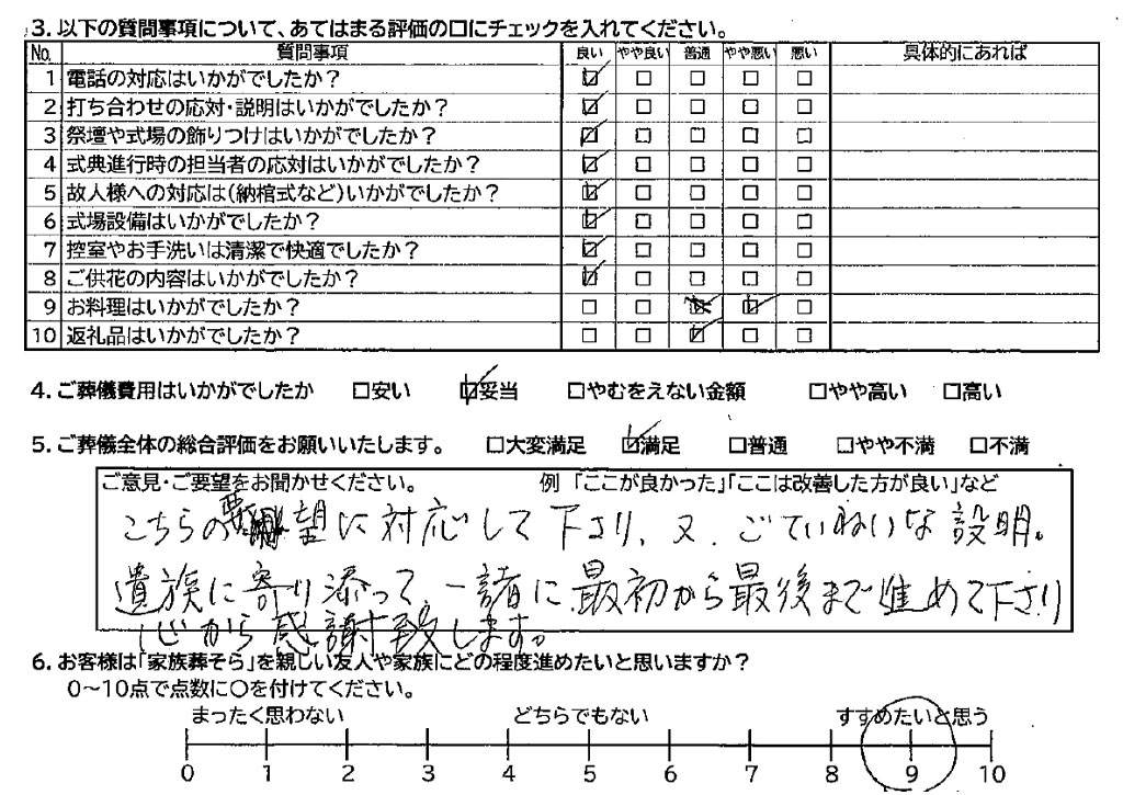 こちらの要望に対応して下さり、又ごていねいな説明、遺族に寄り添って一緒に最初から最後まで進めて下さり心から感謝致します。