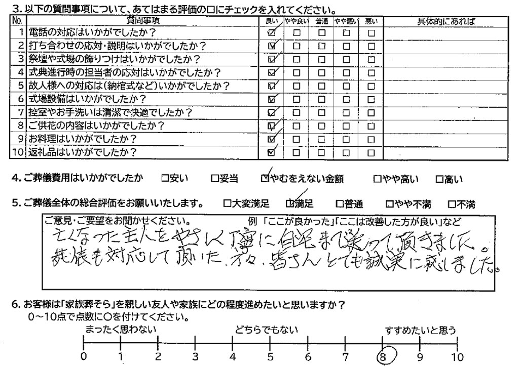 亡くなった主人をやさしく丁寧に自宅まで送って頂きました。