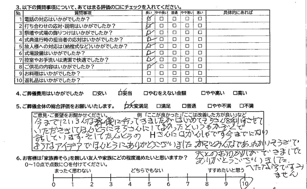 家族葬そらの葬儀への評価