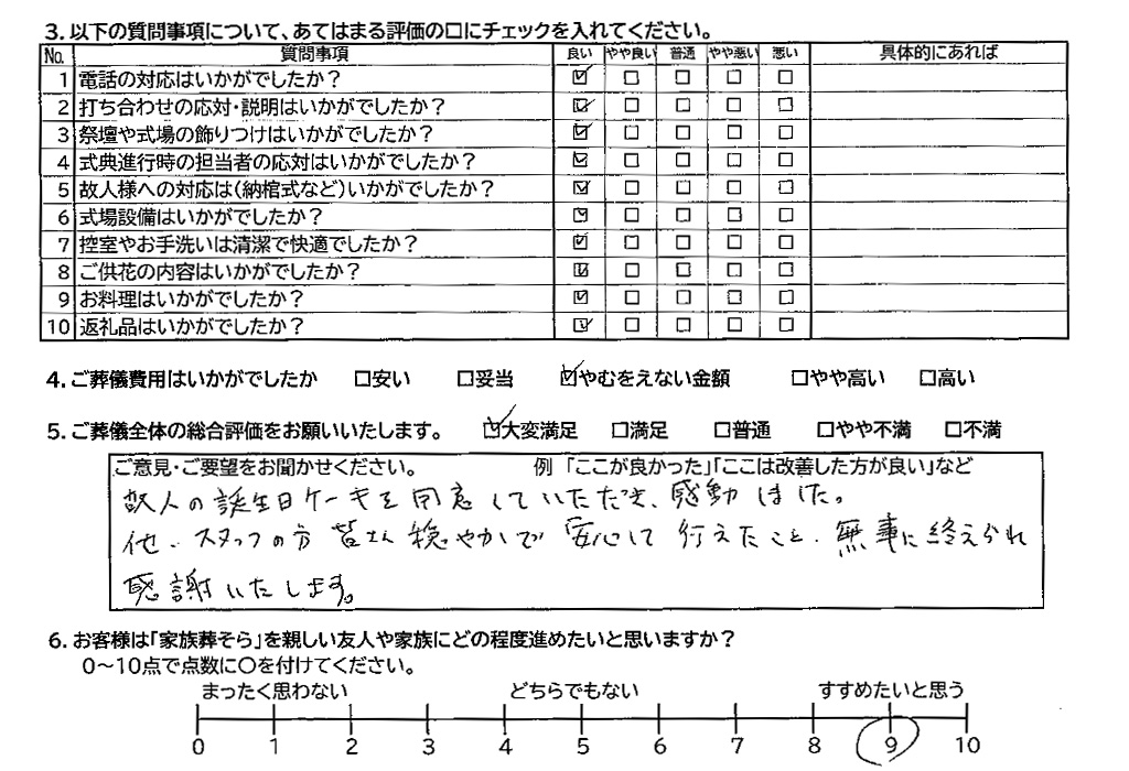 故人の誕生日ケーキを同意していただき感動しました。他、スタッフの方皆さん穏やかで安心して行えたこと、無事に終えられ感謝いたします。