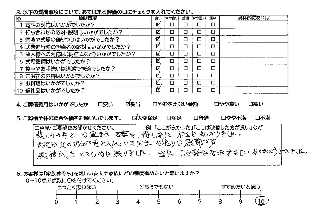 家族葬そらの葬儀への評価