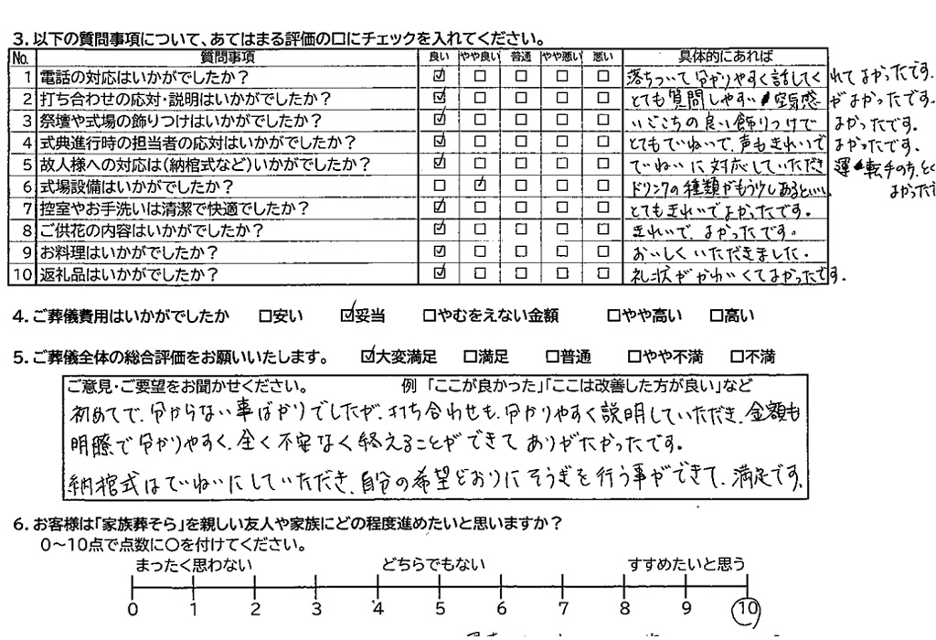 初めてでわからない事ばかりでしたが、打ち合わせも分かりやすく説明していただき、金額も明瞭でわかりやすく全く不安なく終えることができてありがたかったです。納棺式は丁寧にしていただき、自分の希望通りに葬儀を行うことができて満足です。