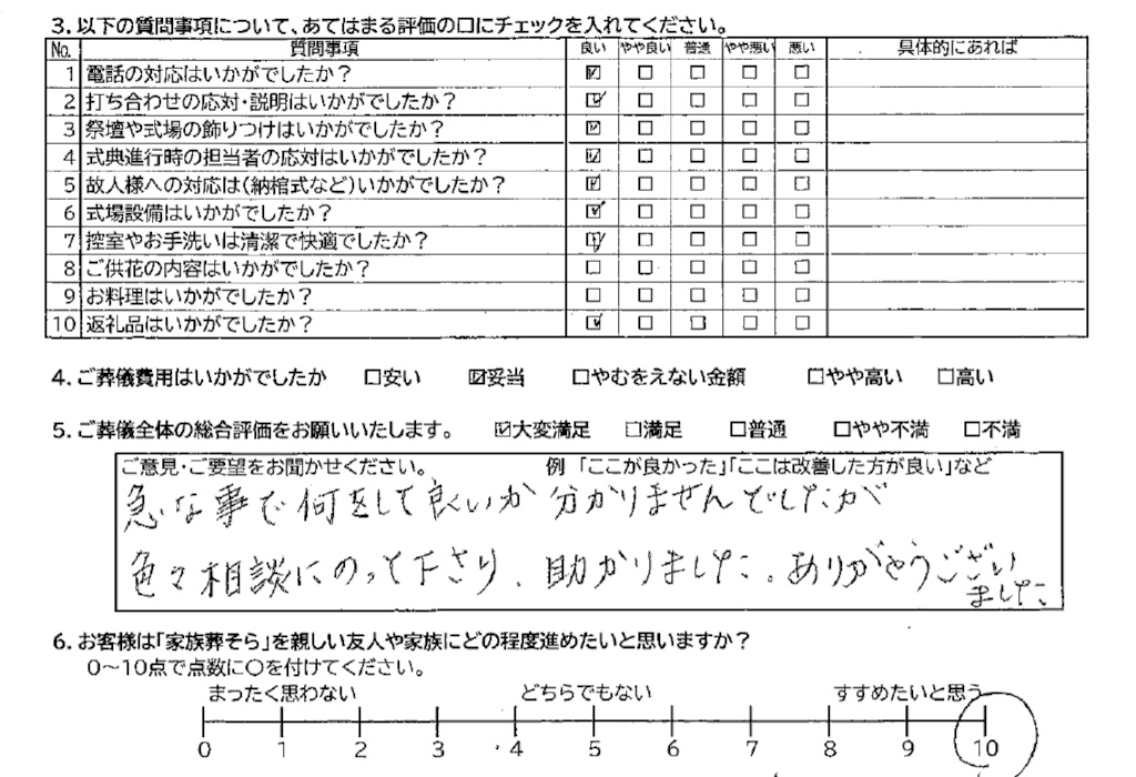 家族葬そらの葬儀への評価