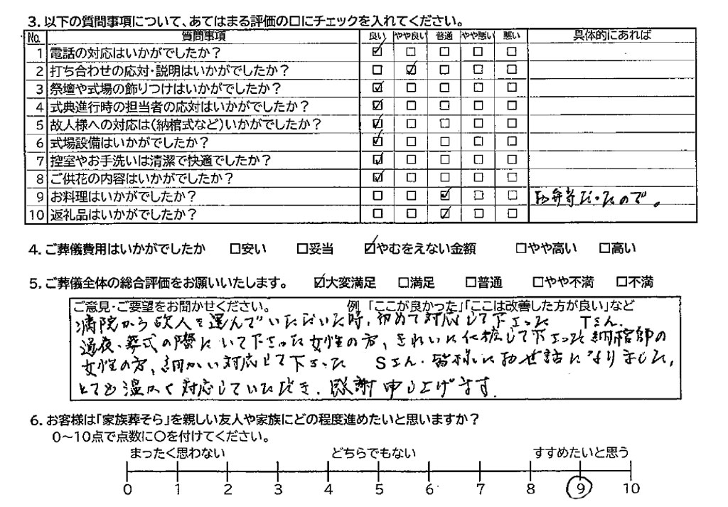 病院から故人を運んでいただいた時、初めて対応して下さったTさん、通夜・葬式の際にいて下さった女性の方、きれいに化粧して下さった納棺師の女性の方、細かい対応して下さったSさん、皆様にお世話になりました。